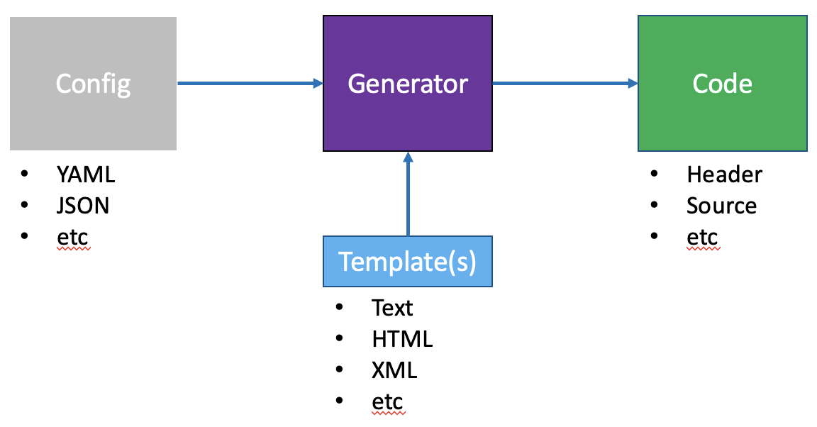 Using YAML, JSON, and XML files has an interesting twist; how does one use these files to configure the C/C++ application? There are several ways, but the method that I’ve used the most is to write a script that reads in the YAML file and then generates the equivalent C code. For example, the process can look something like the following: