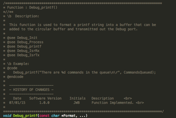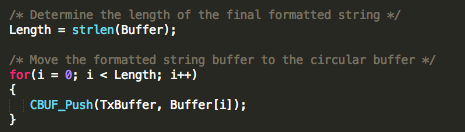 Once the final string has been formatted a standard printf function would just started to sequentially transmit the buffer out over the serial device. The transmission is usually done in a blocking fashion so that no other code is executed until the entire string has been transmitted. Transmitting in this way obviously can and will affect the real-time performance of the system. The longer the string, the worse the response time will get. To improve the real-time performance, the Buffer can be pushed onto a circular buffer that handles serial transmission in an interrupt driven fashion. To learn more about circular buffers please see the post “Open Source Circular Buffers”.